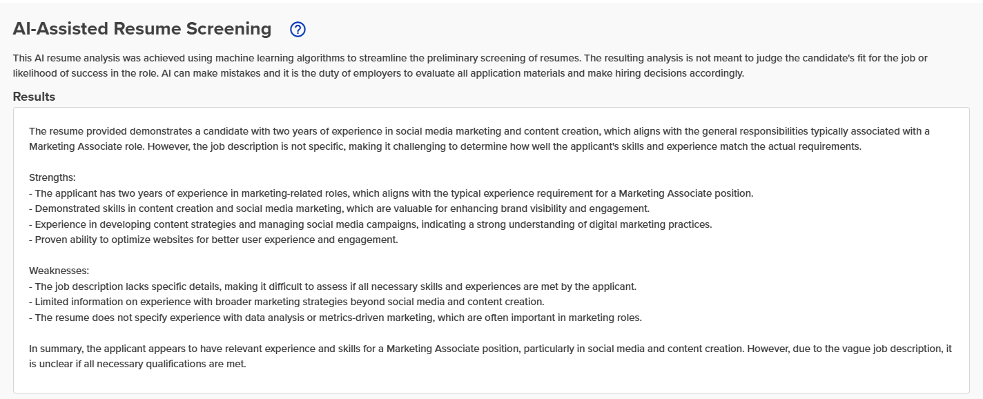 When creating a job description, it's important to include enough details so that the AI feature can provide a useful evaluation. However, we want to make sure that your description is easy for applicants to read and meets the required length. If you're having trouble editing all that info, don't worry! You can use the AI Job Description Creator to get some help.