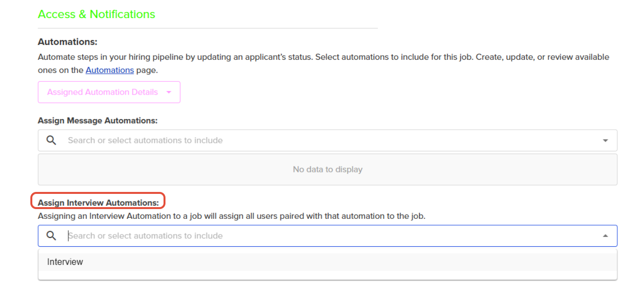 - Navigate to Access & Notifications and select the automation you wish to use from the Assign Interview Automations drop-down.